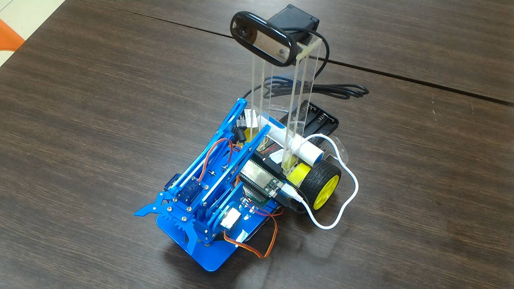 利用聯發科的Linklt Smart 7688所做的WiFi監控移動夾爪,具備監視用的即時影像以及可控制的夾具與移動平台,我們可操控這個移動夾爪來即時執行任務,移除障礙。搭配網路攝影機、機械手臂所架構的工程車,可以藉由手機APP去做監視與控制,也可以兼具教育效果。