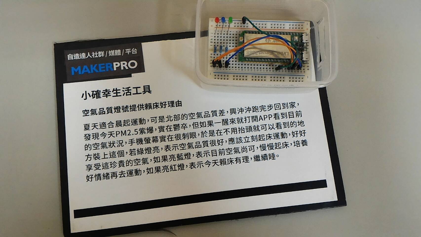 夏天適合晨起運動,可是北部的空氣品質差,興沖沖跑完步回到家發現PM2.5紫爆,實在鬱卒,待如果一醒來打開APP看到目前的空氣狀況,手機螢幕實在很刺眼,於是在不用抬頭就可以看到的地方裝上這個,若綠燈亮,表示空氣品質很好,可以立刻起床運動,好好享受;如果亮藍燈,表示目前空氣尚可,慢慢起床,培養好情緒再去運動,如果亮紅燈,表示今天賴床有理,繼續睡。