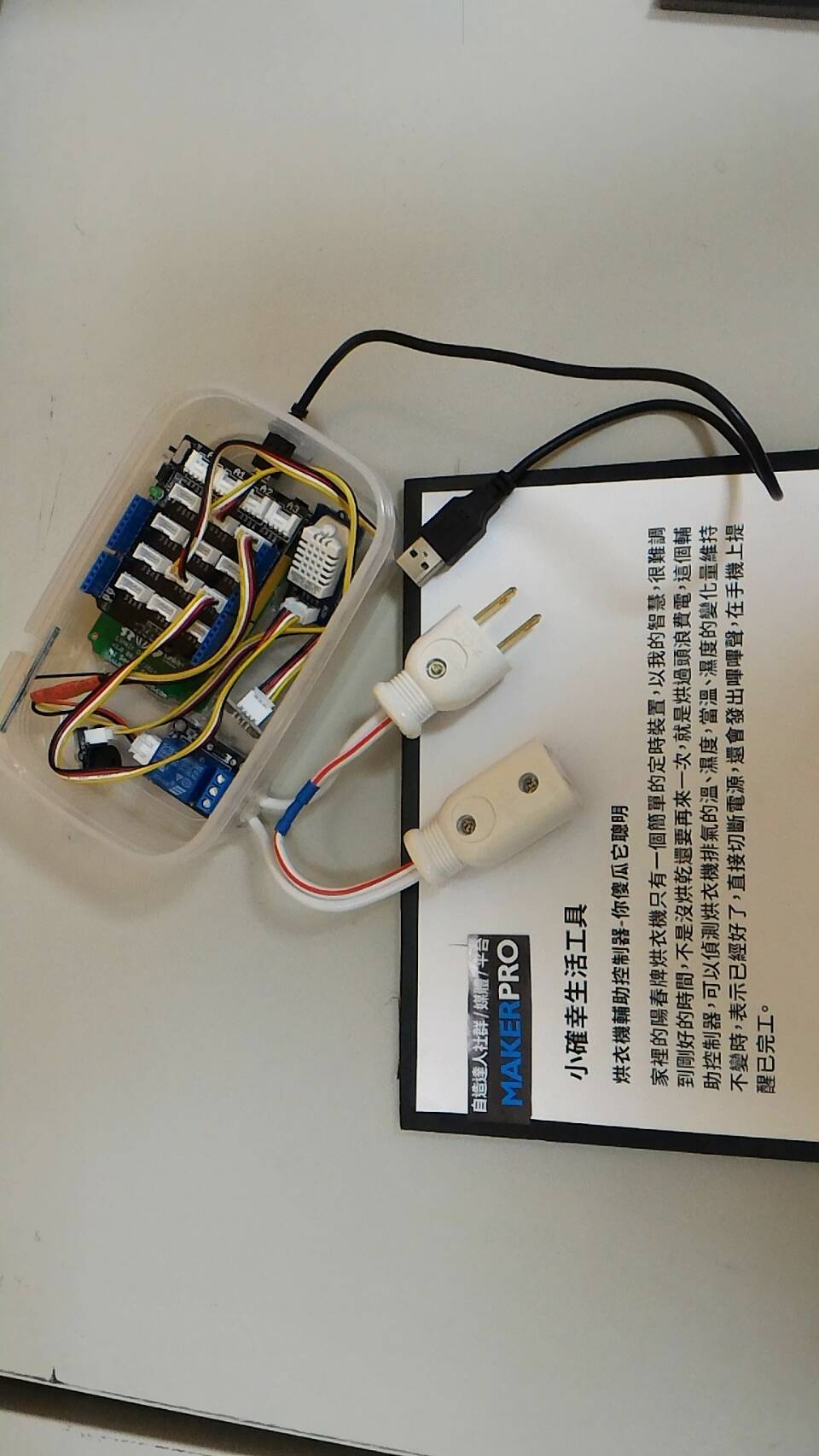 家裡的陽春牌烘衣機只有一個簡單的定時裝置,以我的智慧,很難調到剛好的時間,不是沒烘乾還要再來一次,就是烘過頭浪費電,這個輔助控制器,可以偵測烘衣機排氣的溫、濕度,當溫、濕度的變化亮維持不變時,表示已經好了,直接切斷電源,還會發出嗶嗶聲,在手機提醒已完工。